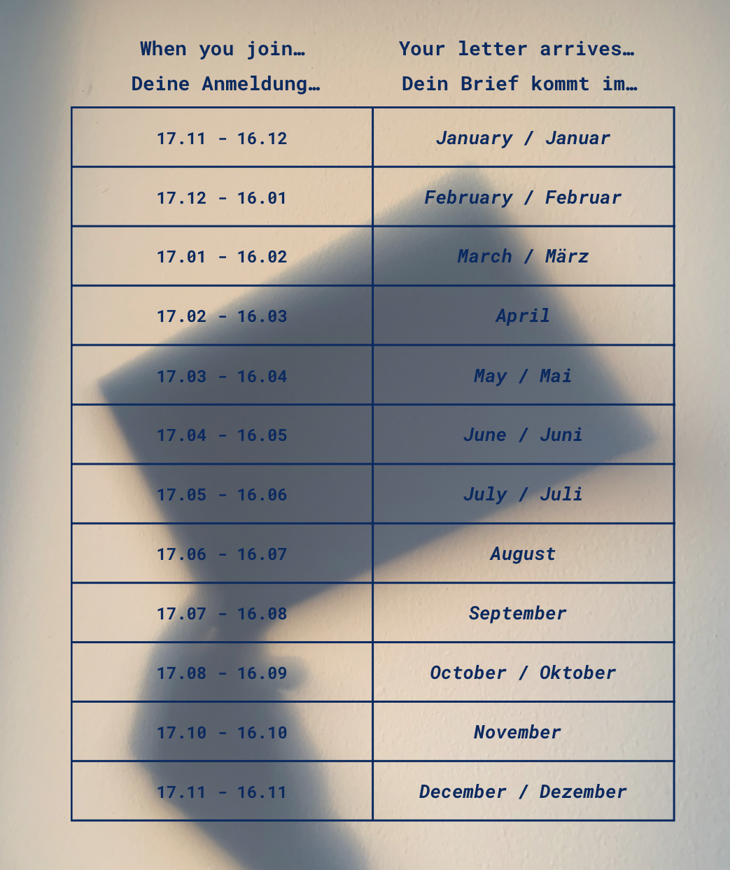 Dein Brief wird bis zum 4. jedes Monats verschickt.